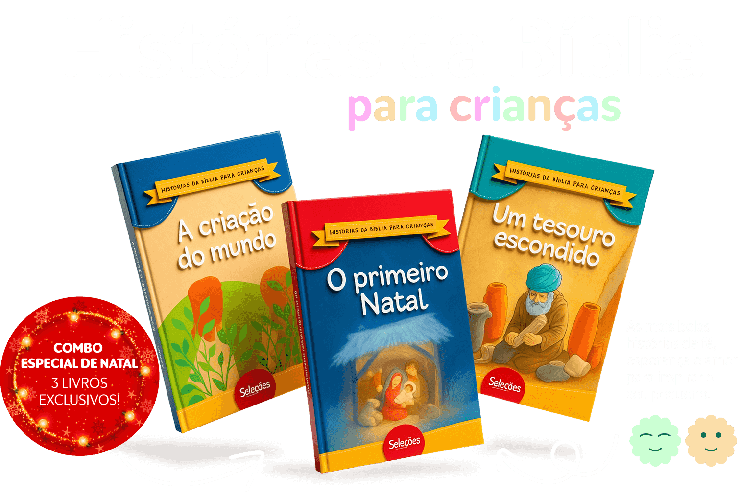 de forma leve, divertida e inesquecível, com 3 livros de capa dura que despertam fé, curiosidade e o verdadeiro espírito do Natal.